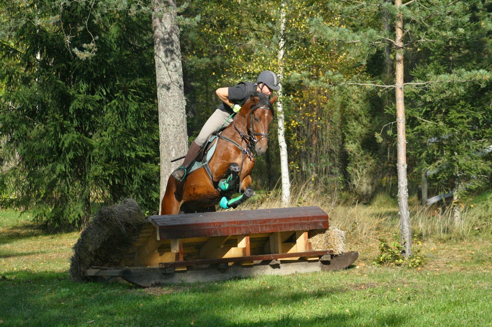 Maastoesteet oli meillä sunnuntaina klo 13-14, Turusta lähdettiin yhdentoista pintaan. Kouluvalmennusta en jännittänyt, mutta esteitä kyllä aavistuksen. Esteille piti verkata hevonen valmiiksi, joten oltiin reilusti aikasissa derbykentän päässä ja ravissa sekä laukassa lämmittelin ruunan. Kentällä oli kaikennäköistä estettä, mutta me hyppättiin vain erinäköisiä tukkeja. Aloitettiin hyvin, Elmo hyppäsi kuin sammakko ja yritin pysyä perässä. Sitten tapahtui esteen ohitus, jonka jälkeen aloin vähän itse epävarmaksi. Pari kertaa jouduttiin lähestymään esteittä uusiksi ohituksien takia, mutta kaikille esteille saatiin hyviä hyppyjä, sen jälkeen kun olin liukunut satulasta alas kolmannelle tukille. :D Hypättiin kolme tukkia ja kakkostukki oli kaikenkaikkiaan vaikein, kun kolmosen jälkeen palattiin kakkoselle.